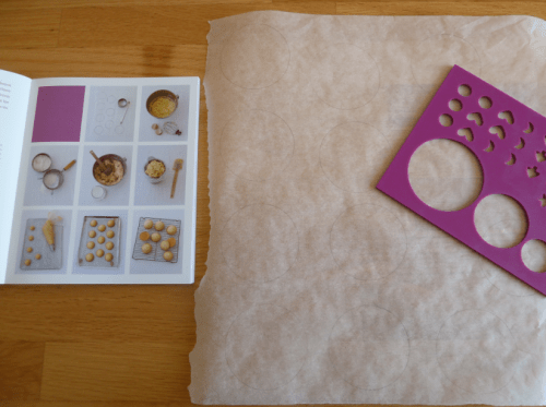 1. On préchauffe le four à 170°C et on commence par prendre sa feuille de papier sulfurisé, on trace des cercles, en faisant bien attention de les espacer. On retourne le papier pour ne pas que la mixture touche le tracé de crayon gris…
