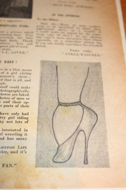 Et oui, en lisant les articles un peu plus attentivement,  on découvre des articles concernant les corsets, les talons très hauts, les gants, les cheveux longs, le cuir… qui peuvent être interprétés de plusieurs façons.  Il s’agit en fait d’un des premiers magazines fétichistes!