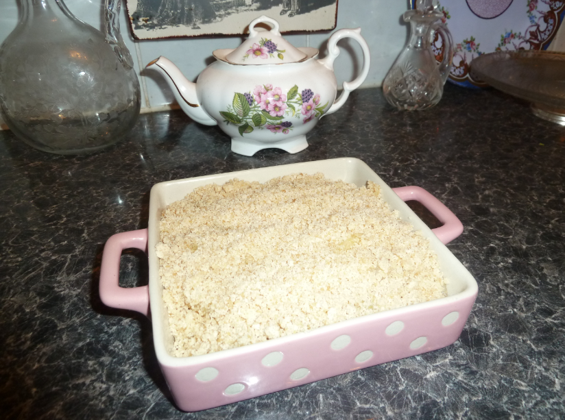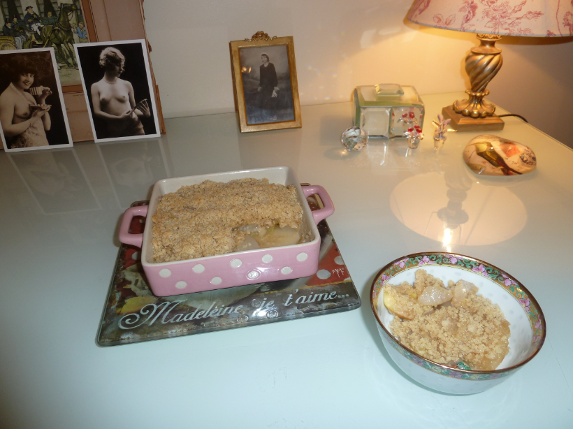 4. Mettre votre crumble au four préchauffé à 180°C, pendant environ 15 min. Sortir votre plus joli dessous de plat en attendant… (Merci Mummy!)