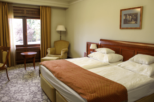 L’hôtel est une ancienne villa de famille. La villa appartenait à la famille Andrassy, une famille noble. On voit que l’hôtel était auparavant une maison familiale, il y a des photos de la famille sur les murs et le salon n’a pratiquement pas été touché. Il y a de la moquette dans les chambres et comme vous pouvez le voir, le style est ancien mais charmant.