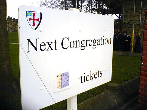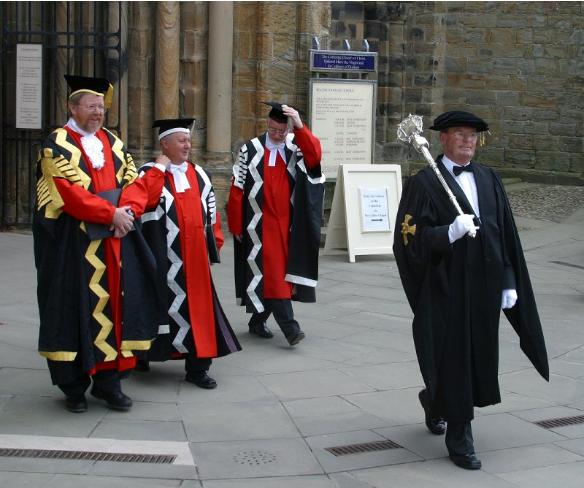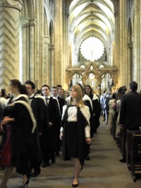Un petit discours puis on nous place par filière et par ordre alphabétique, ce qui prend pas mal de temps. Une fois placés, on marche du Great Hall jusqu’à la Cour extérieure du Château. Le maître des cérémonies refait un discours, on attend un petit peu, puis à 13hrs45 on commence à marcher du Château jusqu’à la Cathédrale. L’idée est que l’on rentre dans la Cathédrale en étant des graduands, et en ressort diplômés, et on obtient donc le statut des graduates.