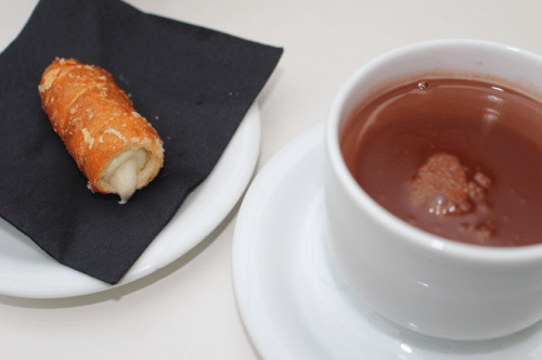 J’ai apprécié le fait qu’il n’y ait pas de Starbucks à Milan (mais ça arrive bientôt, à ce qu’il paraît)! Les premiers jours j’ai cherché un endroit où prendre un café à emporter, puis lors de ma journée touristique j’ai pris le temps de me poser et de prendre un mini chocolat chaud bien épais, servi avec un cannolo. Miam!