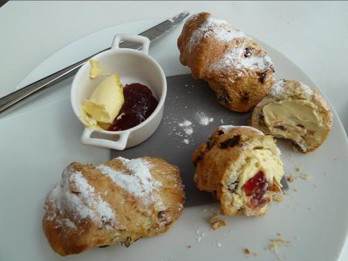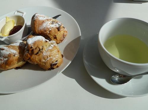 Les scones maison étaient servis tièdes, nous avions deux scones chacun, mais un était bien suffisant car ils étaient plutôt grands et copieux! Les scones étaient soit nature, soit aux fruits secs: raisins, orange…