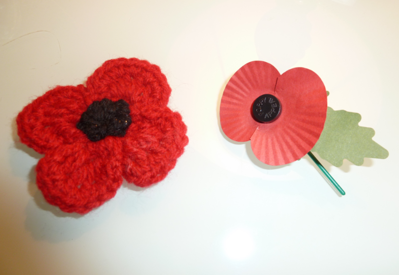 Ci-dessous, à droite voici les Poppy en papier que tout le monde épingle sur sa veste au mois de novembre, et à gauche le Poppy tricoté qu’un des soldats m’a offert: