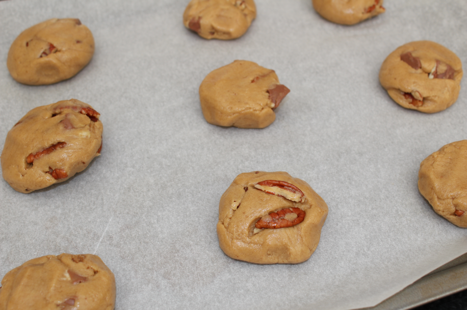 3. Déposer 9 noisettes de pâte sur une feuille de papier sulfurisé en faisant attention de bien les espacer. Enfourner pendant 8 à 9 minutes. Lorsque vous allez sortir les cookies du four, vous aurez l’impression qu’ils sont à peine cuits. C’est normal! En refroidissant, la pâte va durcir et devenir délicieusement chewy. Miam!